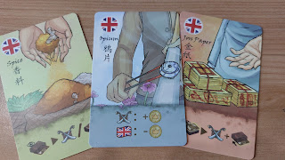 This is the 'River Mat' from the Singapore 1889 game. You shuffle and stack the cards (instructions included) along the river then 'fish' them out. What you 'catch' and what you do with it decides how well you do in the end, which is kind of matches how things worked in Singapore's early days.